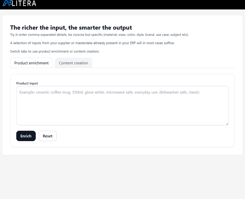 Try our prototype for product enrichment and content generation to see how targeted inputs can unlock practical outcomes. The prompt in the prototype is intentionally wide so it can handle varied material, but it can be refined and customised to match your specific data and goals.